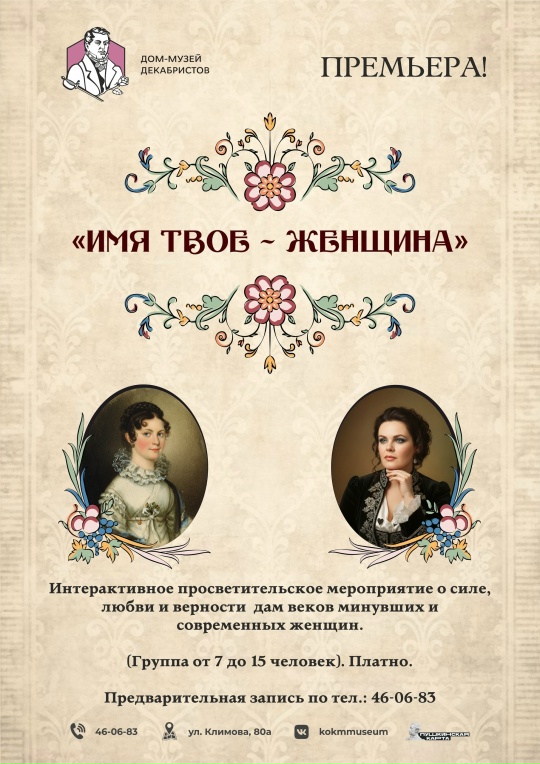 ПРЕМЬЕРА! 6 марта в 15:00 - «Имя твое - женщина!», 16+. Просветительское мероприятие о силе, любви и верности дам веков минувших и современных женщин.