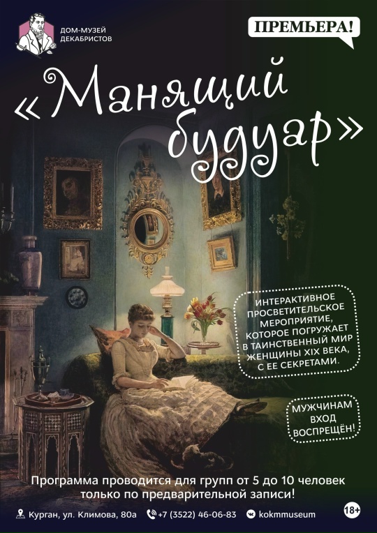ПРЕМЬЕРА! 6 марта в 17:00 - «Манящий будуар», 18+. Мероприятие погружает в таинственный мир женщины 19 века. Мужчинам вход воспрещен!