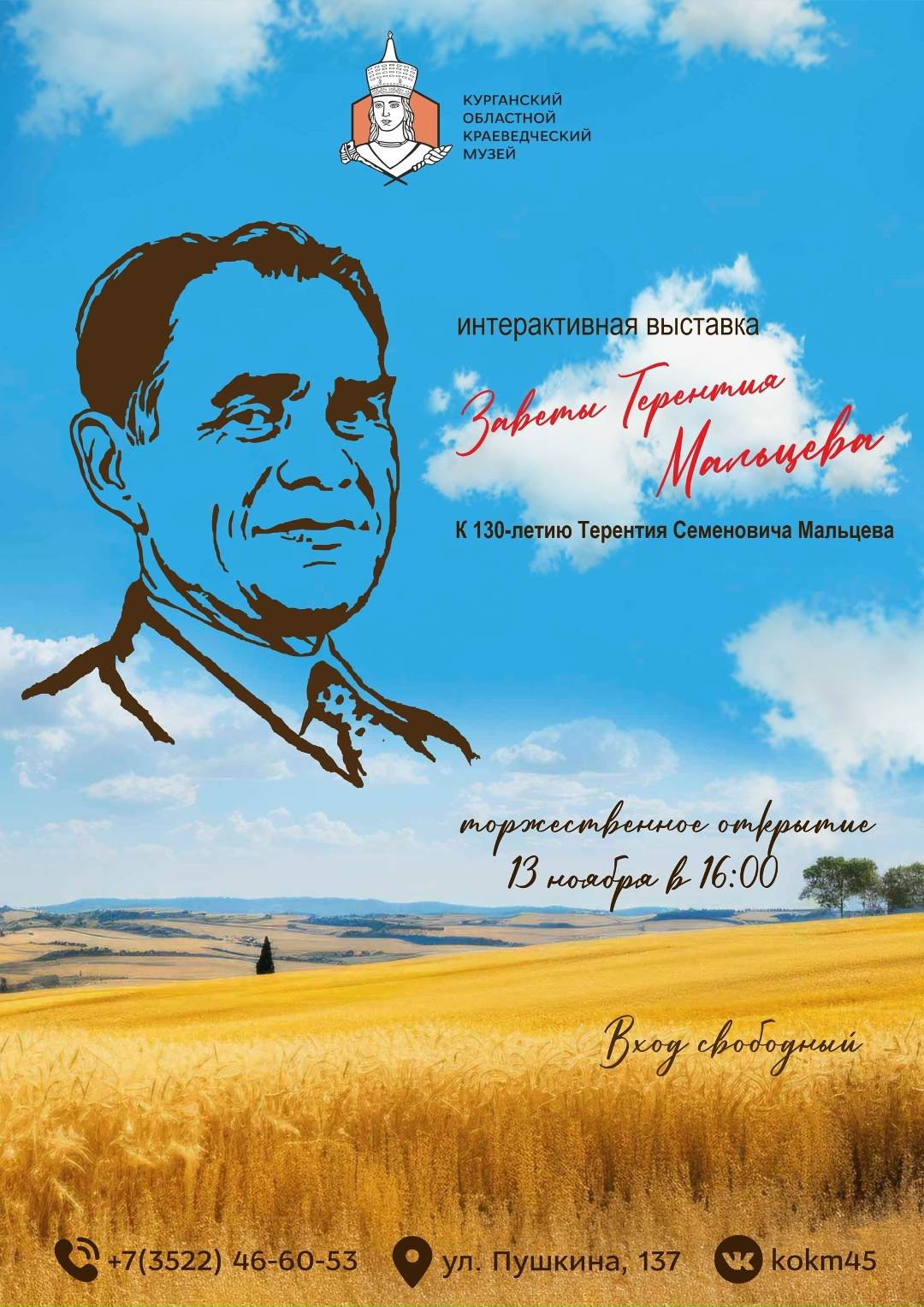 13 ноября 2025 года в 16.00 ч. в Курганском областном краеведческом музее состоится открытие интерактивной выставки «Заветы Терентия Мальцева», посвященной 130-летию со дня рождения выдающегося деятеля сельского хозяйства Курганской области Терентия Семеновича Мальцева.
